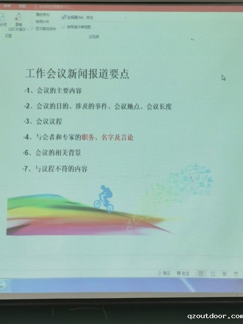 首先由会长助理李贤旭介绍会议目的,宣布会议开始。随后,邀请刘庆辉同学上台进行新闻专项培训。刘庆辉上台进行自我介绍并演示PPT讲解“如何写好新闻”,其新闻专项培训主要包括四部分。一是介绍什么是新闻,新闻的特点及定义;二是新闻由标题、导语、正文、结语组成,并简单介绍各部分的要求;三是怎样写好一篇引人眼球的新闻。该部分又分为两小部分,其中一小部分是举例时下权威媒体的热点实践新闻报道,将新闻四要素逐个分析,让干事们明白一篇合格的新闻是什么样子;另一小部分则是具体提高新闻写作的方法,并用一句话概括为“看报看报再看报”。四是列举新闻创作中应注意的事项,包括新闻的格式,谦敬词褒贬词的运用,行文中的禁忌及图片要求。