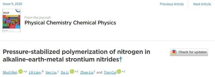 近日,由魏书丽老师撰写题为“Pressure-stabilized polymerization of nitrogen in alkaline-earth-metal strontium nitrides”的文章在知名期刊《Physical Chemistry Chemical Physics》上发表。