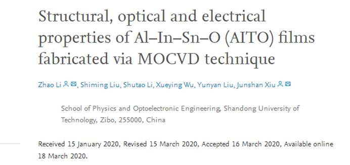 近日,由李钊博士撰写题为“Structural, optical and electrical properties of Al–In–Sn–O (AITO) films fabricated via MOCVD technique”的文章在国际期刊《Journal of Alloys and Compounds》上发表。