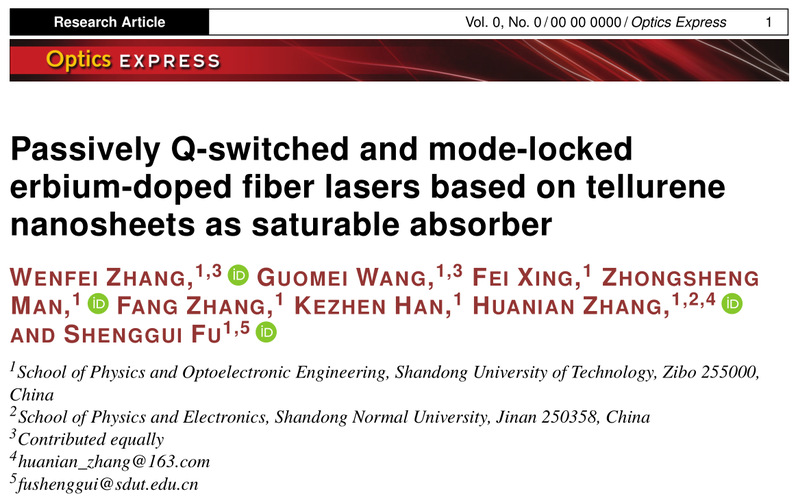 近日,我院激光技术与超快光子学团队在新型可饱和吸收体光纤激光器研究方面获得新进展,研究成果以“Passively Q-switched and mode-locked erbium-doped fiber lasers based on tellurene nanosheets as saturable absorber”为题在光学类TOP期刊《Optics Express》发表,本文张文飞、王国梅为共同一作,通讯作者为张华年副教授、付圣贵教授。