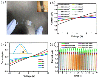 图4. (a) ITO-PET衬底上基于CsPb2Br5纳米片的光电探测器的光学图像。插图:CsPb2Br5纳米片的光学图像。标尺是50 μm。(b) CsPb2Br5纳米片用405 nm波长激光在不同入射光功率下的I-V特性。(c)在不同弯曲角度下测量的I-V特性。插图:弯曲实验示意图。(d)折弯50/100 /200/300/500次前后测得的器件随时间变化的光响应。