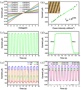 图3 (a)基于CsPb2Br5纳米片的光电探测器在不同入射光功率下的I-V特性。(b)偏置电压为5V时,光电流对光功率密度的依赖关系。插图:制作好的光电探测器的显微镜图像。(c)光强为7.33 mW mm-2、偏置电压为5 V的405 nm激光照射下的时变光电流测量。(d)光电流上升和下降时间。(e)不同电压下的I-T测量,光强为7.33 mW mm-2。(f) CsPb2Br5纳米薄片在室温空气中的稳定性测定