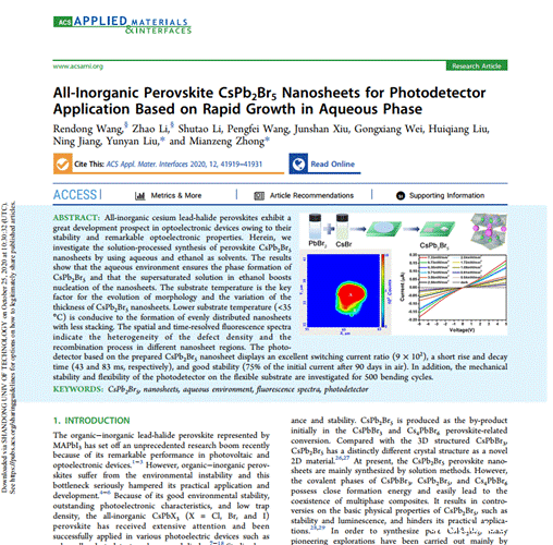 近日,我院先进成像与数据挖掘实验室研究生王仁东在微纳光电探测器研究方面取得新进展,无需昂贵的真空气相沉积系统,该研究采用环境友好的溶剂在固体基底上生长了CsPb2Br5纳米片,通过温度调控解决一般溶液法制备导致的纳米片堆聚问题,而且避免了油胺等有机分子的存在阻碍载流子传输的问题。研究表明,这种方法可以成功在各种材质基底上生长均匀纳米片,较低的生长温度更加其均匀性。空间和时间分辨荧光测量揭示纳米片在不同微区内荧光强度分布和缺陷状态。基于CsPb2Br5纳米片的光电探测器和柔性探测器表现出良好的光电性能和稳定性。制造的光电探测器具有9×102的大开/关比,响应速度快,恢复时间分别为43和83 ms。并首次制备金字塔形的CsPb2Br5纳米片光电探测器,光响应14 mA / W。在柔性基底上制造的CsPb2Br5纳米片的光电探测器表现出出色的环境稳定性和机械稳定性。研究成果以“All-Inorganic Perovskite CsPb2Br5 Nanosheets for Photodetector Application Based on Rapid Growth in Aqueous Phase”为题发表在国际权威期刊《ACS Applied Materials & Interfaces》(中科院分区1区top,影响因子:8.456)上,通讯作者为刘云燕。