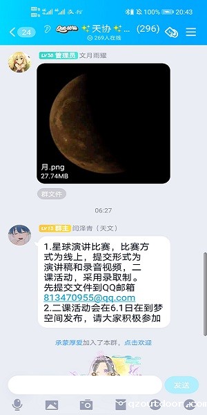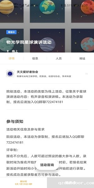为激发同学对星球探索的兴趣,锻炼同学的演讲能力,我院天文爱好者协会于6月1日在腾讯QQ举办星球演讲活动。此次活动由天文爱好者协会负责人闫泽青主持。