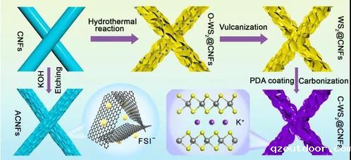研究人员发现,作为支撑骨架和生长模板的碳纳米纤维可以实现WS2纳米片的均匀生长,改善储钾反应动力学,并促进电化学转化反应;碳包覆可缓冲电极充放电过程中的体积膨胀,增加电极导电性。作为钾离子电池负极,该电极材料表现出优异的储钾比容量和倍率性能。基于原位拉曼、原位X射线衍射、非原位透射电镜以及第一性原理计算,阐明了WS2与K+的储钾反应机理,即插层反应(WS2→KxWS2)和转化反应(KxWS2→K2S5→W+ K2S)相结合的反应机理。基于该电极材料构建的钾离子电容器表现出180.4 Wh kg-1的能量密度,这是目前国际上报道的最高水平之一。