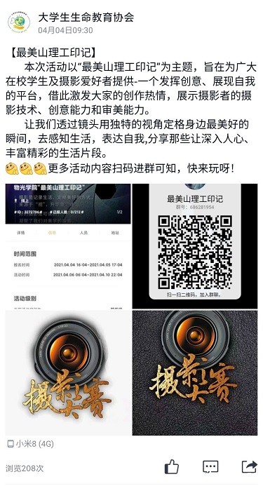 我院于4月6日至4月10日举办物光学院“最美山理工印记”活动。活动由物光学院主办,由大学生生命教育协会承办,会长刘澳负责活动各项事宜。此次活动目的是为了丰富我校师生的校园生活,展示在校大学生多姿多彩的生活,增强学生艺术与审美的交流,也为诸多摄影爱好者提供一个展示自我的平台,以此激发大学生对摄影的兴趣和爱好,更加关心、了解生活体验校园文化,记载激动人心,感人至深的瞬间、留住温馨的欢笑回忆,分享快乐美好瞬间。