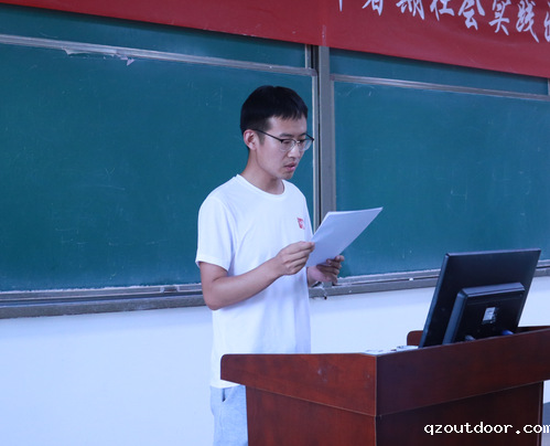 紧接着,实践团学生代表杜成龙进行发言。他阐述了社会实践在大学生活中的重要性,希望同学们敢于吃苦,不怕困难,发扬“奉献、友爱、互助、进步”的志愿者精神。