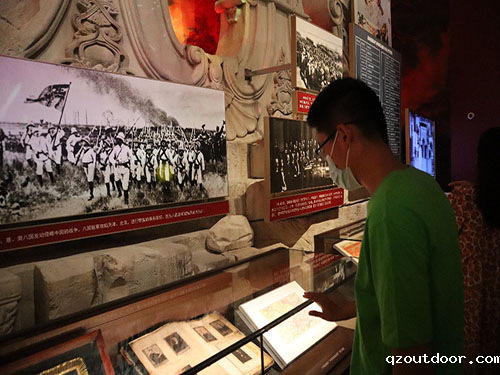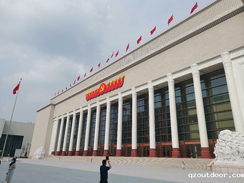 14根大理石圆柱挺立在展览馆的西侧,白色大理石的柱身和光滑的红色大理石柱底,宏伟的建筑,无一不彰显着象征党的光辉历史。