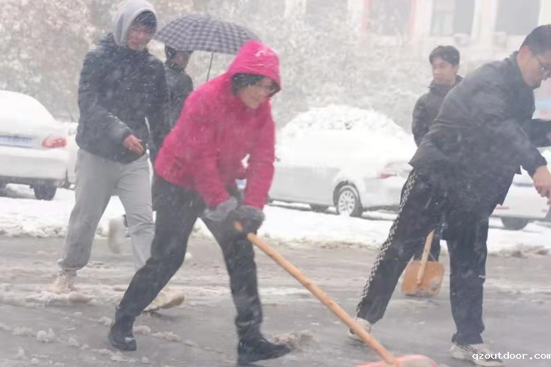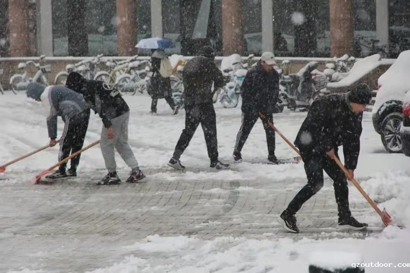 本次除雪活动,我院主要清理了15号教学楼门前及文明路上的积雪。参与除雪的老师及学生,携带着由学院统一准备的铁锹和扫帚等工具,首先在15号教学楼门前集合,由付圣贵和范小平分别带领学生会成员和学生党员,从15号教学楼门前,有序的向外清理。几支小队各自分工,经过1个多小时的努力奋战成功将负责区域积雪清扫干净。