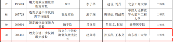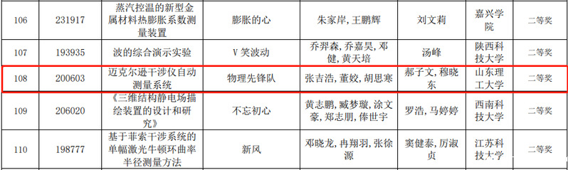 近日,在刚刚公布的第七届全国大学生物理实验竞赛(创新赛)比赛结果中,我院学生竞赛取得历史性突破。物教2001张吉浩、董姣、胡思寒的参赛作品“迈克尔逊干涉仪自动测量系统”荣获自选类竞赛作品二等奖(指导教师为郝子文、穆晓东);物教1801赵兴涛的参赛作品“迈克尔逊干涉仪测激光波长”荣获讲课竞赛作品二等奖(指导教师为孙玉萍、王本义),实现学院在国家级A类学生竞赛中历史性突破!