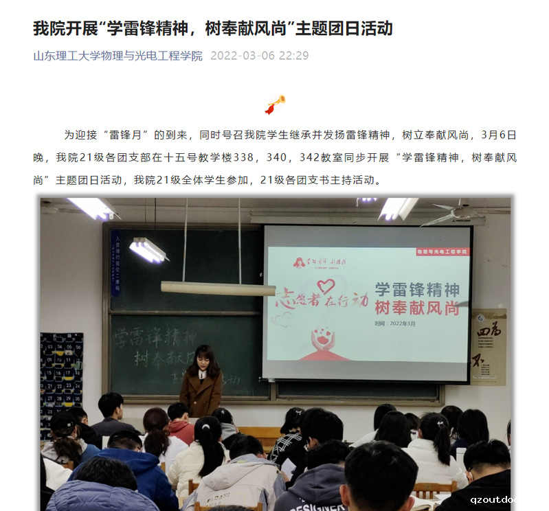 为迎接“雷锋月”的到来,同时号召我院学生继承并发扬雷锋精神,树立奉献风尚,3月6日晚,我院21级各团支部在十五号教学楼338,340,342教室同步开展“学雷锋精神,树奉献风尚”主题团日活动,我院21级全体学生参加,21级各团支书主持活动。