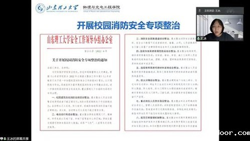 会议共分两项议程。第一项,党委书记王冰传达了学校下发的《关于开展校园消防安全专项整治的通知》。她强调,校园消防安全专项整治要结合学院实际情况,坚持以问题隐患为导向,认真贯彻落实好学校有关要求,进一步推动校园消防安全走深走实。接下来学院将紧紧围绕校园建筑自动消防设施、电动自行车、消防安全疏散通道、违规存放易燃易爆危险品、违规使用易燃可燃材料装修、防火分隔、重点岗位人员责任落实、规范日常管理机制和常态化宣传教育培训等九个方面的内容进行全面自查,开展专项治理。第二项,组织全体教职工观看消防安全警示教育片,该片通过安全事故回放、专家点评等形式,深入剖析了近年来发生的重大安全事故案例,以触目惊心的画面和震撼人心的事实,唤醒大家的安全意识,具有很强的震撼力和说服力。影片中重点讲解了当遇到不同火灾事故时,应如何进行人员疏散、自救、逃生等消防知识技能,教育并警示人们火灾事故的严重危害性,提醒大家要时刻关注消防安全。