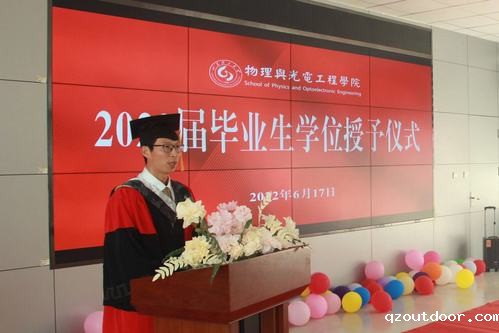 随后,毕业上代表光电1801班纪强同学发言,他回忆了自己在学校的求学和成长经历,他感谢学校学院在短短四年的本科生涯里给予他的平台,并表达了对母校、对学院、对老师们的感激与不舍之情和争做栋梁、报效祖国的决心。经过大学四年的培养,他成功考取山东大学攻读硕士学位。