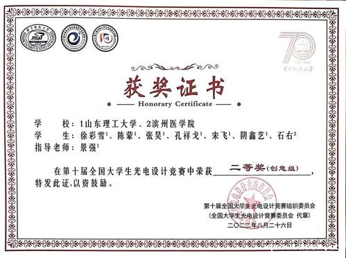 近日,在刚刚公布的第十届全国大学生光电设计大赛比赛结果中,我院学生竞赛取得历史性突破。由徐彩雪、陈蒙、张昊、孔祥戈、宋飞、阴鑫艺、石右等同学的参赛作品《一呼即测—糖尿病新型检测手段开拓者》(指导教师为景强)在比赛中经过激烈角逐荣获第十届全国大学生光电设计竞赛二等奖(创意组),为我院创出佳绩!