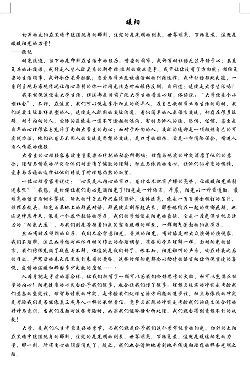 我们希望通过本次活动提高同学们的心理素质,加强同学们的心理承受能力,希望同学们用一颗积极乐观的心态来面对人生,也能勇敢的追寻自己未来。在本次交稿中,同学们用笔去书写他们对生活的理解与期望,也会有当下的迷茫与困惑。在有当下迷茫的同时,也在寻找解决问题的方法。聆听着过往,展望着未来。