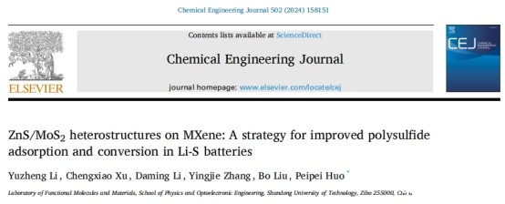我院霍培培副教授指导团队在电化学储能领域取得重要进展,相关论文以“ZnS/MoS2 heterostructures on MXene: A strategy for improved polysulfide adsorption and conversion in Li-S batteries”为题,发表在国际知名期刊《Chemical Engineering Journal》(中科院工程技术类一区TOP,IF=13.3)上。我院2022级研究生李玉正为第一作者,霍培培副教授为通讯作者,我院为第一通讯单位。原文链接:https://doi.org/10.1016/j.cej.2024.158151