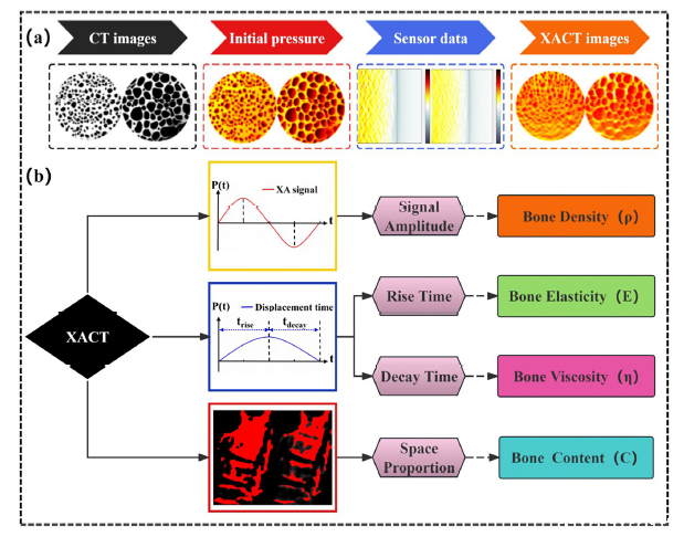 本文提出了一种基于X射线诱导声学计算机断层成像(XACT)实现骨组织弹性和粘性力学检测的新方法,通过理论建模团队成功推演出XA信号的上升时间与衰减时间与骨组织弹性和粘度之间的关系,并利用XACT清晰呈现了风湿性与正常骨组织的微观结构差异与粘弹性差异。