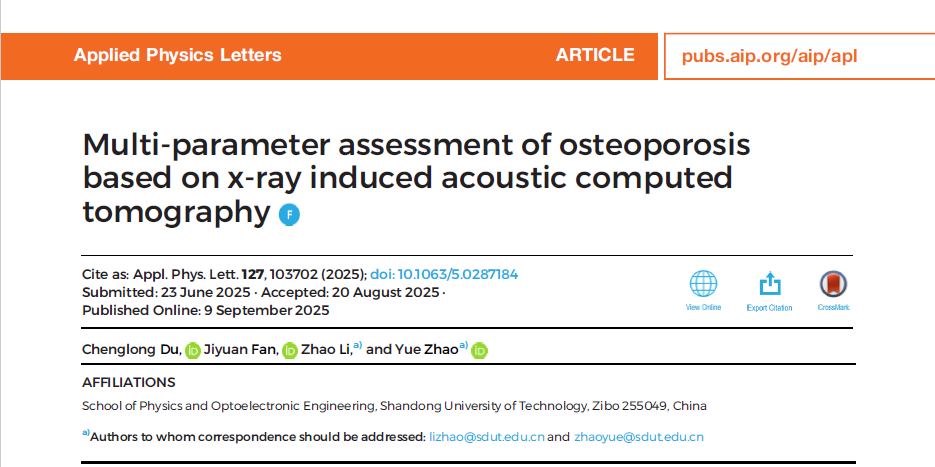 2. Multi-parameter assessment of osteoporosis based on x-ray induced acoustic computed tomography. 我院2023级研究生杜成龙为第一作者,李钊副教授和赵岳副教授为共同通讯作者,我院为独立通讯单位。原文链接:https://doi.org/10.1063/5.0287184